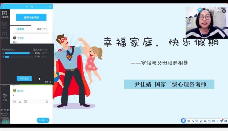 2月8日下午,由校党委学生工作部主办,365电子娱乐官方网站、机械工程学院及莳心工作室承办的 “寒假与父母和谐相处”专题心理讲座在腾讯课堂举办,旨在引导广大学生在寒假能更好地与父母和谐相处,感受家庭的温暖与幸...