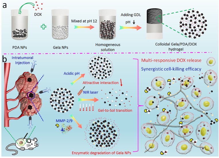 实验结果表明,由于对肿瘤弱酸性微环境及较高浓度的基质金属蛋白酶高度敏感,这一新型水凝胶在包载化疗药物阿霉素后注入肿瘤组织,可实现肿瘤局部长效的药物释放。同时,其纳米组成单元中类黑色素聚多巴胺粒子的存在,使该材料可同时实现近红外激光介导的热促药物释放及肿瘤的热化疗协同治疗,提高肿瘤的治疗效率。