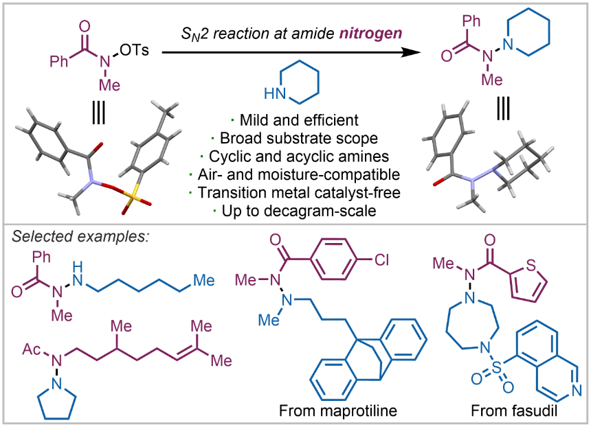针对上述问题作者提出了一种使用脂肪胺作为亲核试剂在酰胺氮原子上进行SN2反应的NN成键方法,该方法为酰肼衍生物的合成提供了一种新的策略。这种新的NN偶联方法,使用易于合成的O-对甲苯磺酰异羟肟酸酯和商业可得的一级、二级胺以及多种胺类上市药物反应,实现复杂酰肼结构的快速合成。该反应具有条件温和、不使用过渡金属催化剂、底物范围广、官能团兼容性好和可放大等特点。通过动力学、取代基电子效应等实验研究,作者证实了该反应经过SN2历程。此外,自由基捕获实验排除了该反应是自由基过程的可能性,计算化学研究结果也与上述实验结果匹配。总之,本研究成功实现了基于酰胺氮上SN2反应的酰肼合成。该反应不仅丰富了酰肼类分子的合成方法,还可能对酰胺氮原子上SN2反应的进一步研究有所启发。