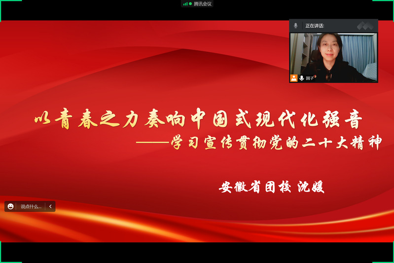 为学习宣传贯彻党的二十大精神,119日,365电子娱乐官方网站于线上线下组织开展了“以青春之力奏响中国式现代化强音——学习宣传贯彻党的二十大精神”专题报告会,特邀安徽省团校副教授沈媛线上主讲。365电子娱乐官方网站团委书记万代林主持报告会,学院第七期团校培训班全体学员、学院第68期入党积极分子班、发展对象班、预备党员班全体学员,学院团学组织(含研究生会)全体成员近400人参加学习。