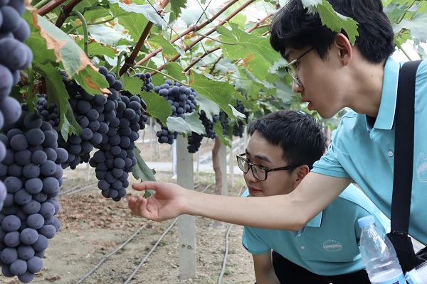 当天下午,实践团队来到了位于巢湖岸边的大圩生态园,通过调研了解到大圩镇结合自身实际,依托当前巢湖生态状况,以“产业兴旺、生态宜居、乡风文明、治理有效”为理念,打造金融、科研、旅游、文化、生态保护为一体的特色乡村振兴示范镇。在大圩镇圩实葡萄园,负责人介绍了园中葡萄种类、生长情况及当前葡萄市场行情等。团队成员通过与农户深入交流,了解到葡萄种植通过购买先进滴灌设备、邀请农业专家进行技术指导等举措不断提升葡萄口感品质、增加产量,同时通过使用生物有机肥实现农业生产更绿色、更可持续发展。
