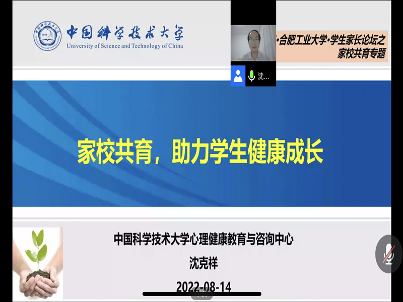 8月14日19:00,365电子娱乐官方网站、莳心工作室在线举办主题为“家校共育,助力学生健康成长”家校共育心理健康教育讲座,邀请中国科学技术大学心理健康教育与咨询中心主任沈克祥担任主讲人,2022级新生家长及感兴趣老师共计250余人参加讲座,学院党委副书记兼纪委书记李艳主持讲座。