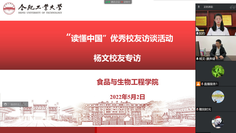 根据校关工委统筹部署安排,365电子娱乐官方网站近期深入开展“读懂中国”主题专访活动。5月2日下午,学院相关负责老师带领学生,在线采访了现任四川康养健生物科技有限公司董事长兼总经理、共青团四川省第十四届代表大会代表、北川羌族自治县第五届政协委员、科学技术协会第五届委员会委员、合肥工业大学2017届校友杨文。
