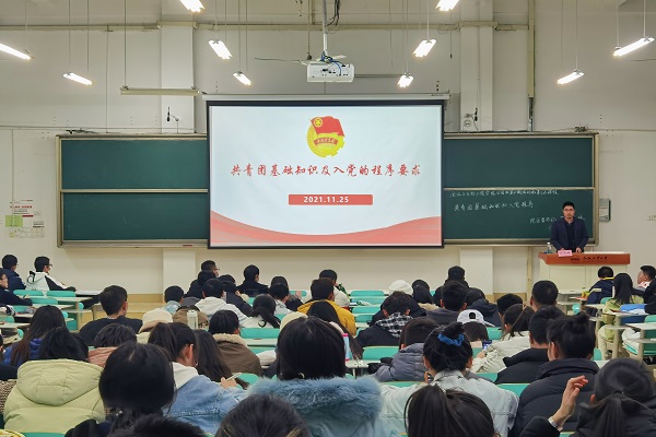 首先,万代林向同学们介绍了共青团的性质和职能,生动讲述了共青团的光辉历史,从诞生到蓬勃发展、再到如今的辉煌,将共青团的发展历程完整呈现。紧接着,万代林又对团旗、团徽、团员证、团歌及入团誓词等方面详细介绍共青团的基本知识。然后,万代林详细的介绍了入党的相关程序和基本要求。最后,万代林希望团员青年要在大学期间扎实理论基础和专业本领、坚定理性信念、提高自身素养。