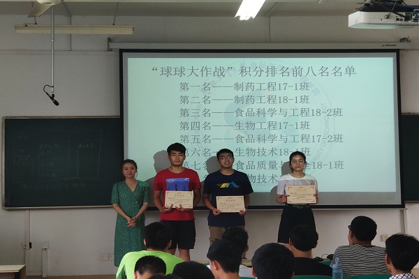 本次赛事在学院全体师生共同支持、参与和努力下,经过贯穿一个学期的激烈角逐,终于落下帷幕。2019年6月27日下午4点,学院在10教201举办第一届体育风采展示节闭幕式,制药工程17-1班、生物技术18-1班、食品科学与工程17-2班一路过关斩将,分别荣获篮球、羽毛球和乒乓球联赛的冠军;制药工程17-1班位列积分榜首;食品科学与工程17-1班荣获体育风采奖。