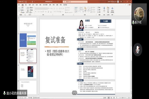 食科、食安专业场中,受邀校友郭淑君同学从个人简介、备考经验、面试经验三方面展开讲述,强调了面试时专业英语的重要性;随后,王超同学则以个人经历分享了复试时如何搜集信息,耐心讲解了复试时的重要时间节点,并向与会同学推荐了相关备考资料。最后,贺雄同学以食品科学与工程专业为例分享了复试专业课范围、复试内容及复试材料准备等经验。