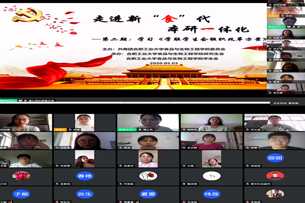 为激发学生组织改革动力,提高组织的积极性、创新性和自主性,使学生组织更好地代表和服务广大同学,2020年5月3日下午3点,365电子娱乐官方网站通过腾讯会议平台成功举办第二期走进新“食”代系列主题活动。本期活动主题为“学习《学联学生会组织改革方案》”,学院学生会、研究生会全体成员参与此次活动。