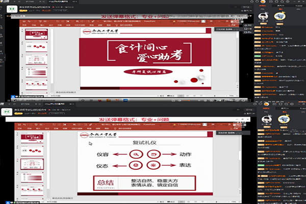 本次直播活动主要分为嘉宾介绍、面试心理、专业答疑、弹幕互动四部分。活动开始,主持人杨程英首先对参与本次复试指导的四位嘉宾分别进行了介绍,并强调本次活动仅围绕去年复试经验进行分享,不以任何形式解读今年复试文件。接着,研究生会主席鲁旭锋就心理建设和复试礼仪方面进行讲解,建议考生复试中应“整洁自然、稳重大方、表情从容、镇定自信”。