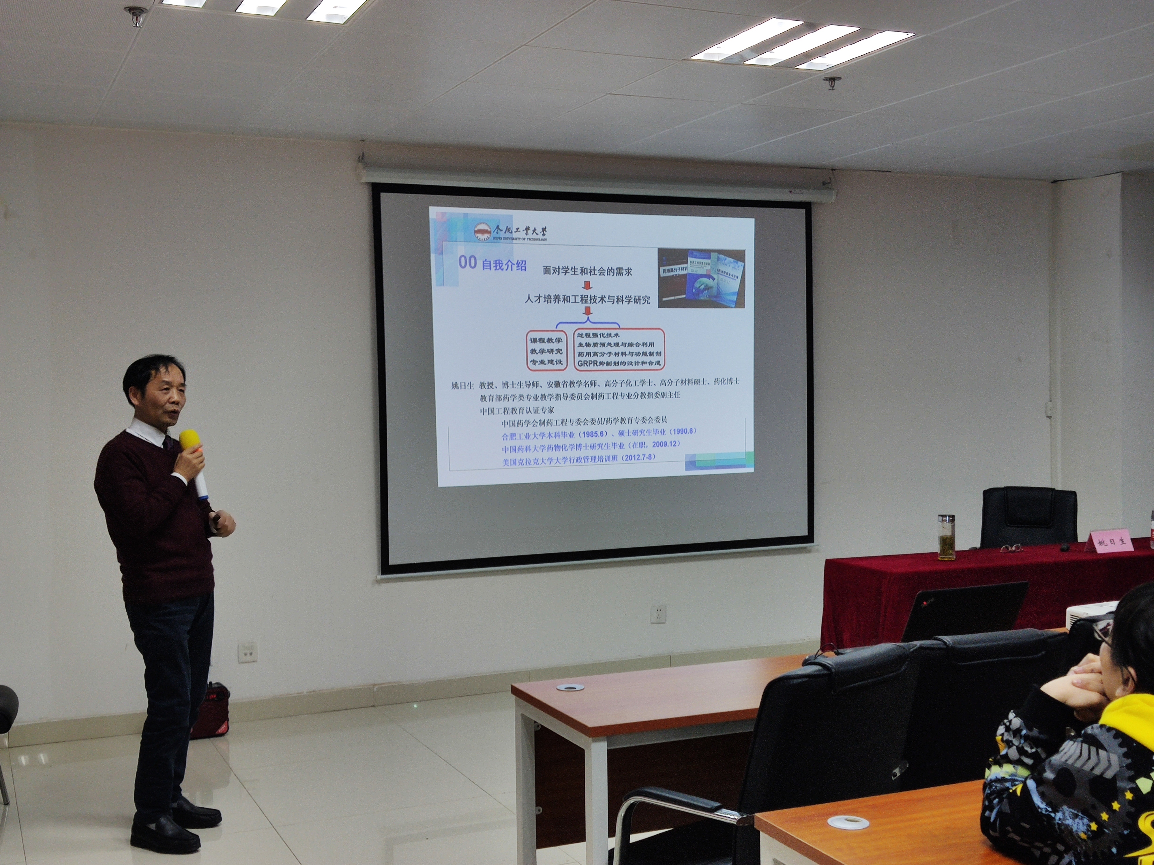 在主持人一段简短的嘉宾介绍之后,姚日生教授在同学们的热烈掌声中以一种极其幽默的方式开始了今天的演讲。姚老师先用一个个简单而又精确的数字回忆了自己的职业生涯:从在设计院工作的2年,到研究院的8年,再到合肥工业大学工作至今的21.6年,姚老师兢兢业业,勤勤恳恳,从实际出发并结合理论,解决了无数的工程难题,为我国制药化工领域的发展做出了贡献。之后,姚老师结合以往的研究工作经验,将同学们带入过程工程的奇妙世界之中,告诉大家工程不是越复杂越好,简单的流程及装置系统更能体现工程的妙美,并带来高的效率和低的差错。