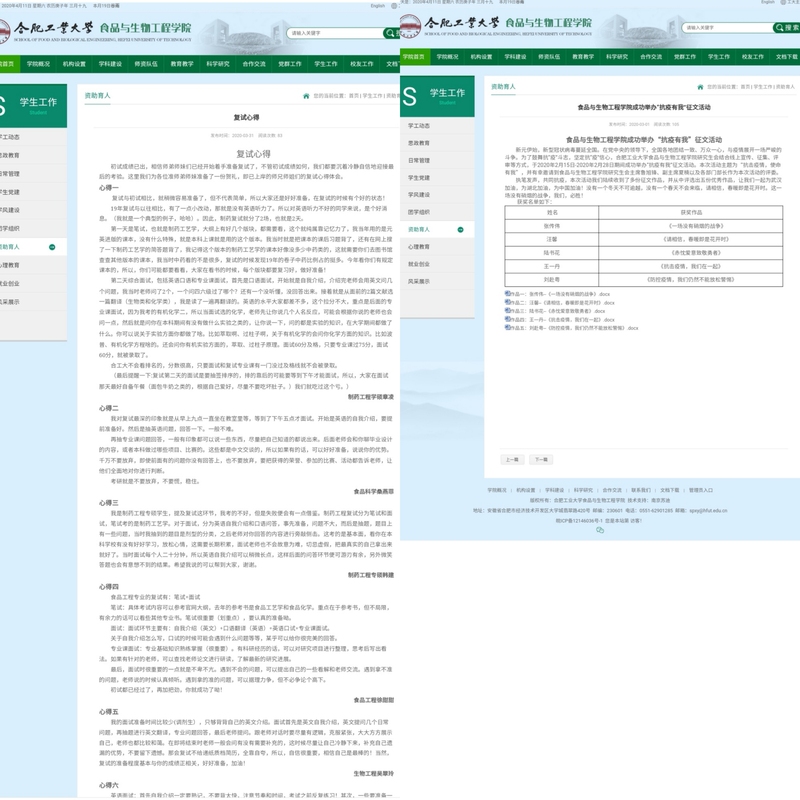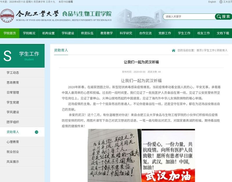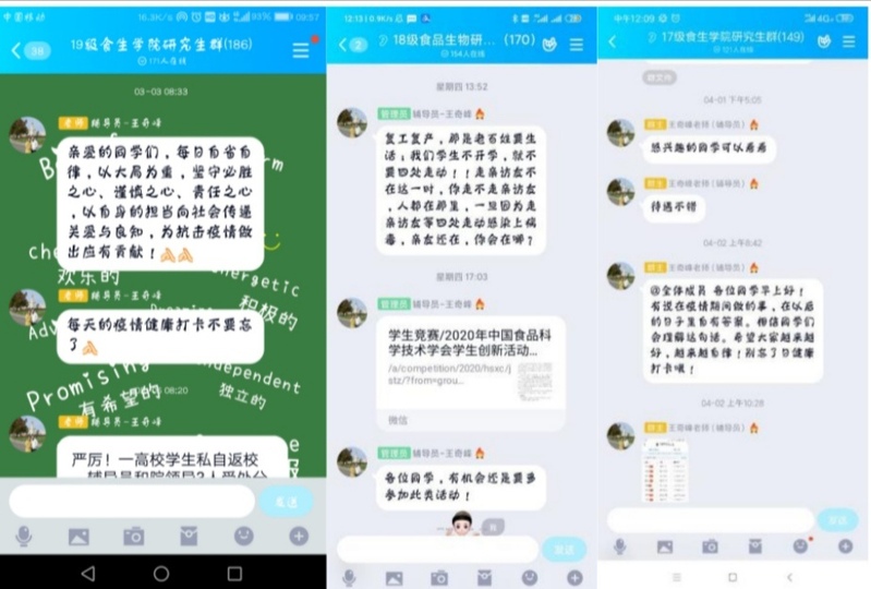 自疫情发生以来,学院通过 QQ 群、微信公众号积极传达中央文件精神,发布疫情防控倡议书,向全院师生普及疫情防治知识,全面统计师生情况,实时更新,及时上报;辅导员严格执行学院要求,通过班级群向每一位同学传达各项通知,做到人人阅读,及时反馈,并通过“今日校园”软件按时发布疫情报表,叮嘱学生完成每日健康打卡,减少外出;研究生会骨干成员通过微信公众号平台定期发布“防疫安全播报”,自 1 月 27 日发布“防疫安全播报第一弹”以来,截至今日已播报 50余次,总浏览量高达 9900 余次,日均浏览量达 195 次,涉及国际疫情、全国疫情、安徽疫情、武汉疫情、合肥复工复学、合肥工业大学最新通知等多个版块内容,为食生学院的学子搭建一座了解疫情的“云桥梁”。研究生会同时在线上开展征集祝福语“为武汉祈福”、“抗疫有我”征文、“分享考研复试心得”、组织观看“消防直播”等活动,鼓励居家的我们停课不停学,齐心渡难关。