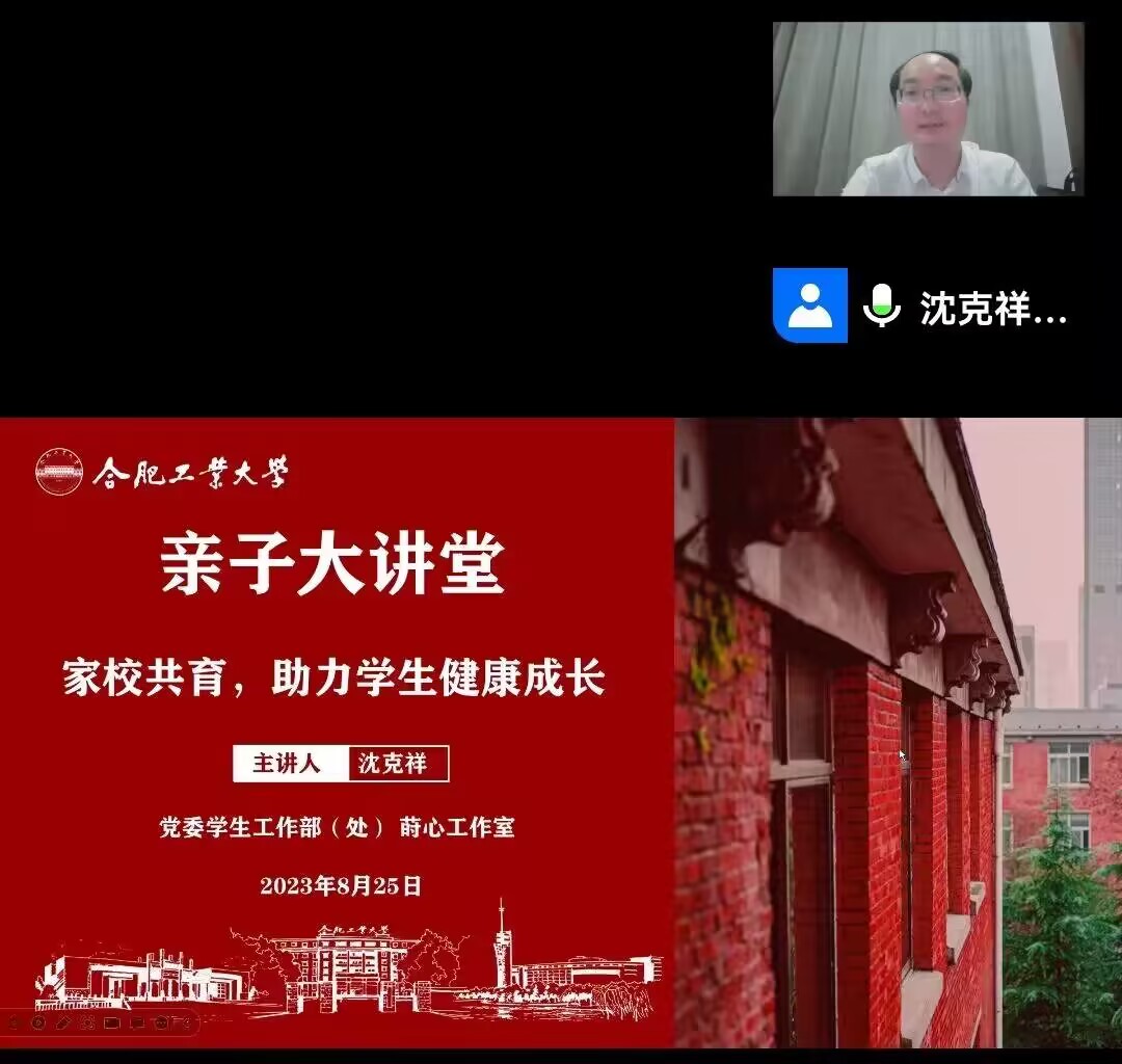 为加强家校共育,凝聚育人合力,进一步做好2023级本科新生心理适应性教育,8月25日晚,由校党委学生工作部(处)主办、莳心工作室承办的第二期亲子大讲堂在线上开展。中国科学技术大学心理健康教育与咨询中心主任沈克祥受邀为家长作了题为“家校共育,助力学生健康成长”的报告,365电子娱乐官方网站党委副书记兼纪委书记李艳主持会议,全校学生家长共500余人参会。
