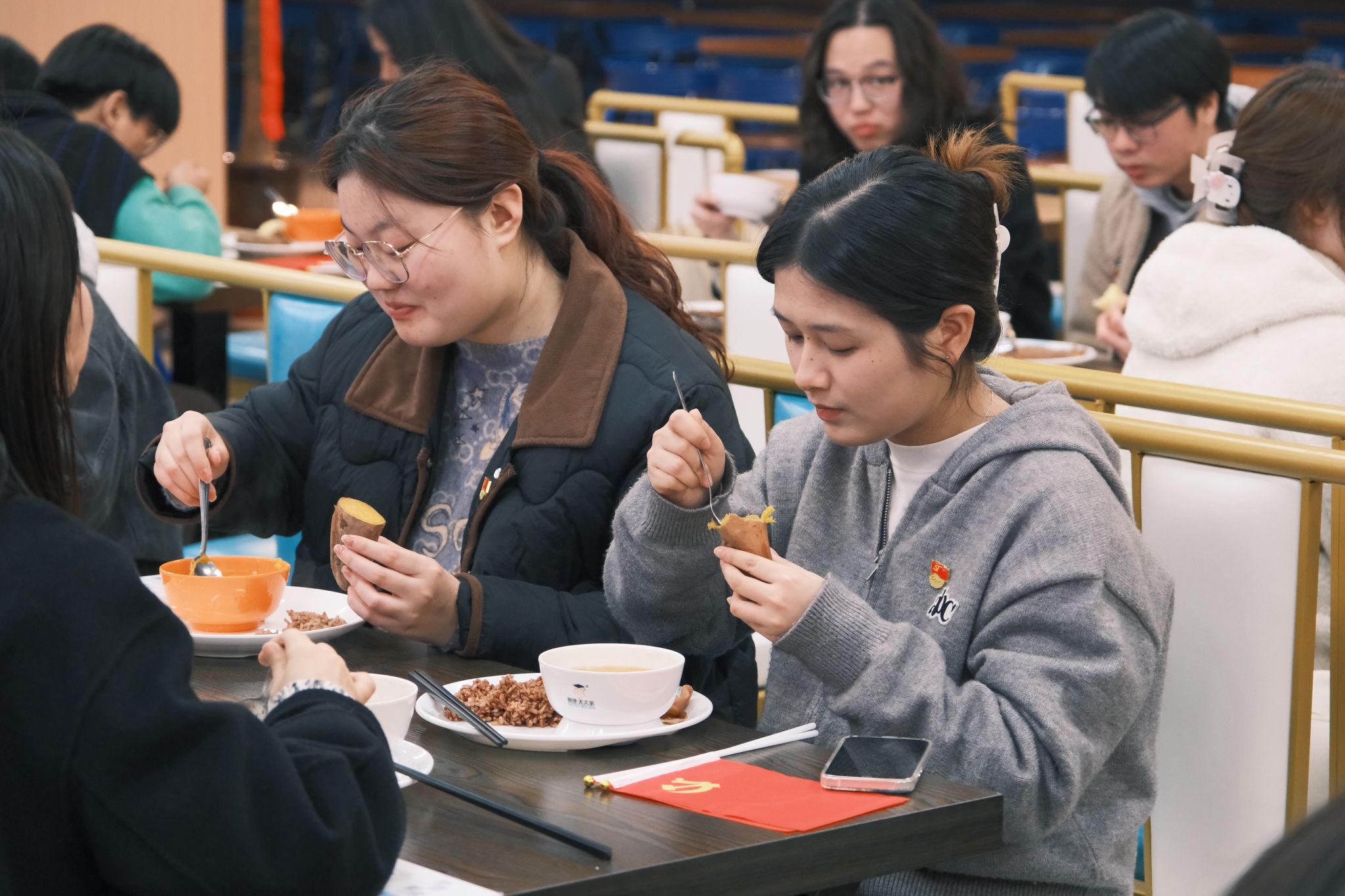 接着,校饮食服务中心为同学们准备了忆苦思甜饭,同学们细细品味煮红薯、窝窝头、糙米饭和南瓜粥,饭菜的简单无味让同学陷入深思,支部党员李思琦在用餐后与同学们分享感受:“刚刚在吃窝窝头的时候,我感觉难以下咽,噎得慌。不敢想象革命先辈们在战争年代靠着吃野菜、啃树皮,用坚强的意志保家卫国,这是何种精神在支撑着他们?我们这一代人生活在物质极其丰富的年代,更应该珍惜来之不易的幸福生活。”支部党员王松则说:“这次活动的活动形式非常好,只有亲身体验过才会有更加真切的感受,在今后的生活中我们应该养成节省朴素的生活习惯,并以实际行动接过社会主义现代化建设的接力棒!”