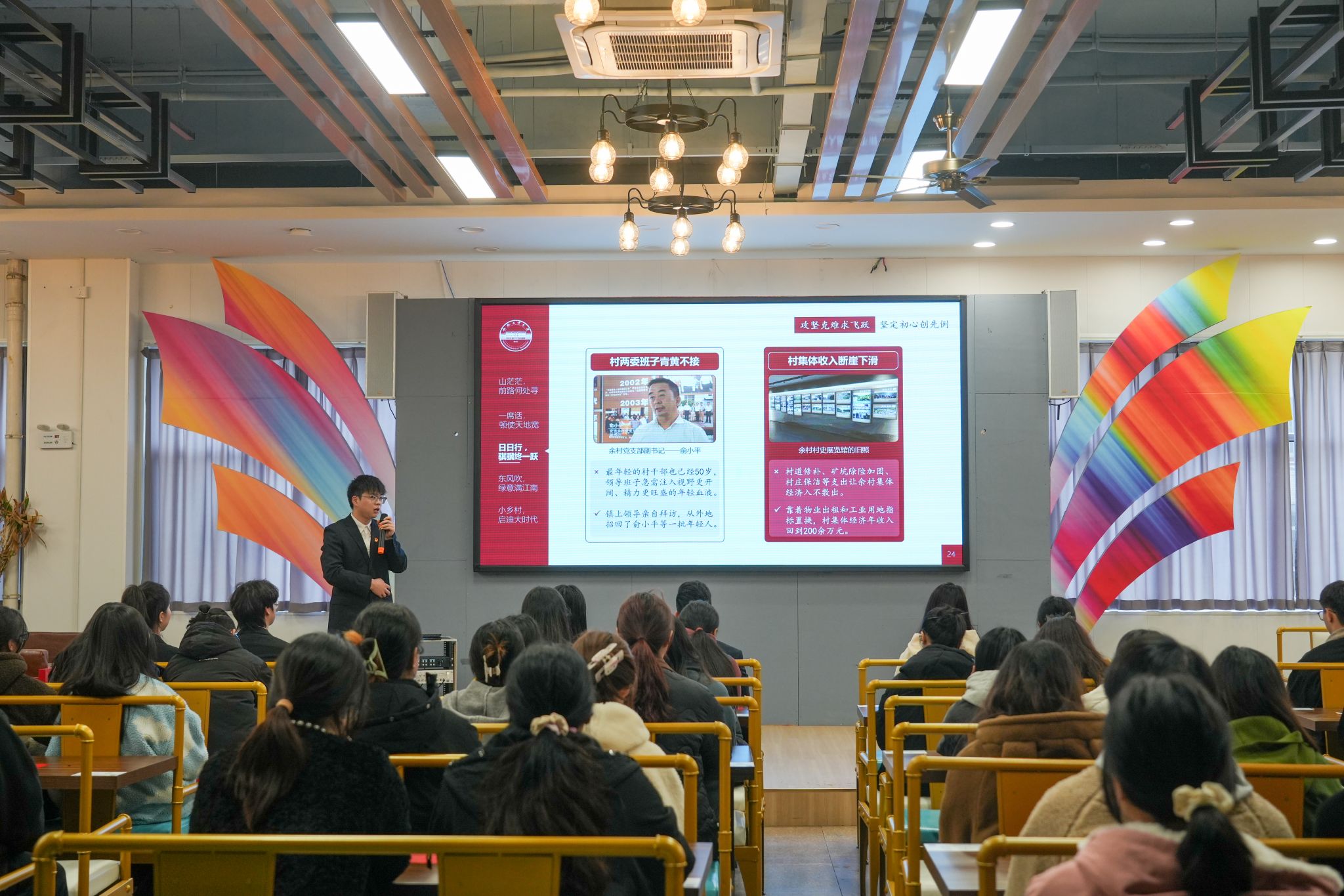 活动共分为三个环节。首先由支部宣讲团成员方师承向大家讲授题为《人不负青山,青山定不负人》的主题党课,他从“山茫茫,前路何处寻”“一席话,顿使天地宽”“日日行,骐骥终一跃”“春风吹,绿意满江南”“小乡村,启迪大时代”等几个篇章,讲述了余村人探寻绿色发展之路,践行“绿水青山就是金山银山”绿色发展理念的生动故事。以安吉人的视角,方师承讲述的故事令在场学生动容,大家纷纷感叹探寻绿色发展的乡村振兴之路十分不易,并下定决心以实际行动担负起时代和历史使命。
