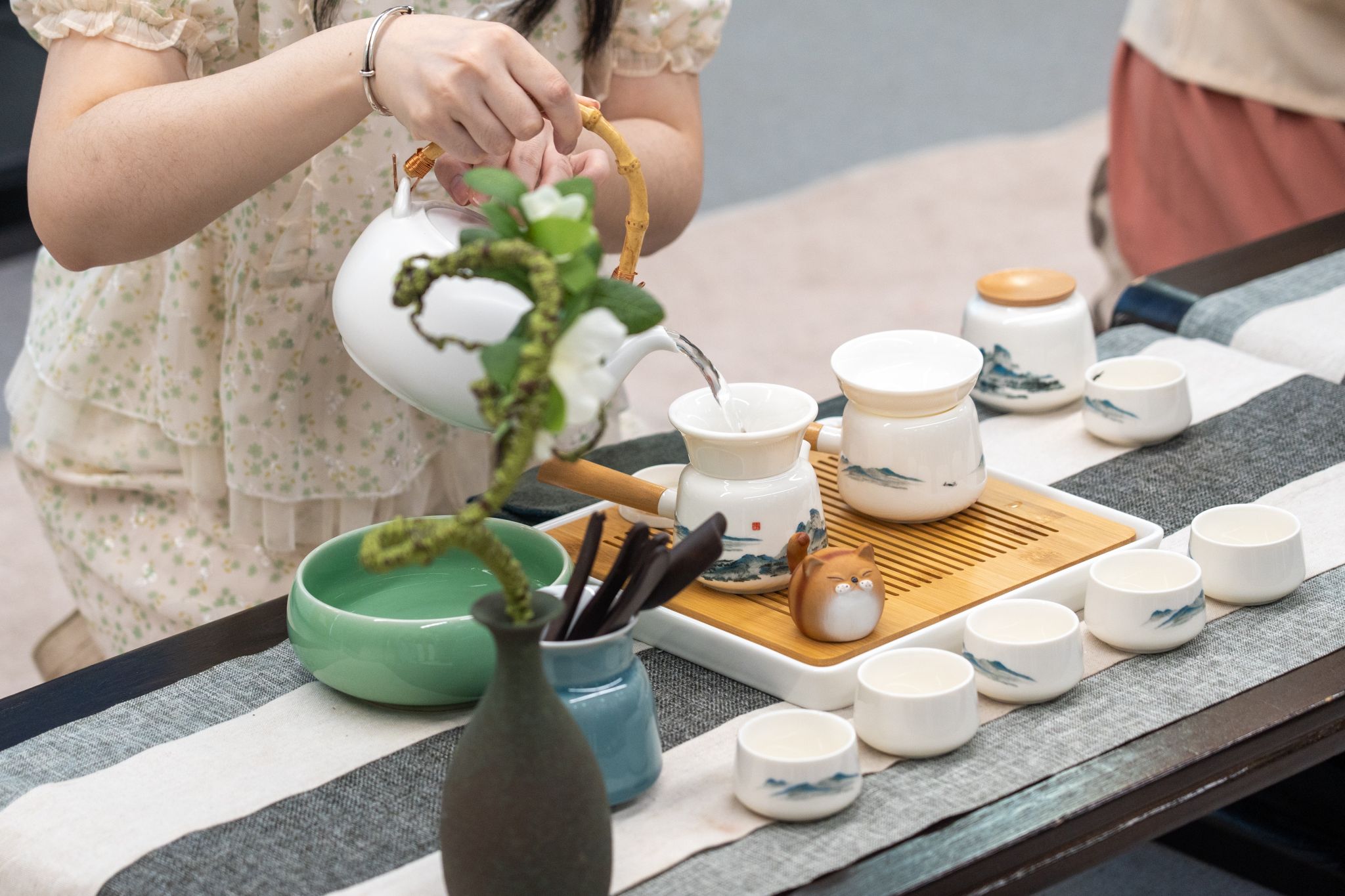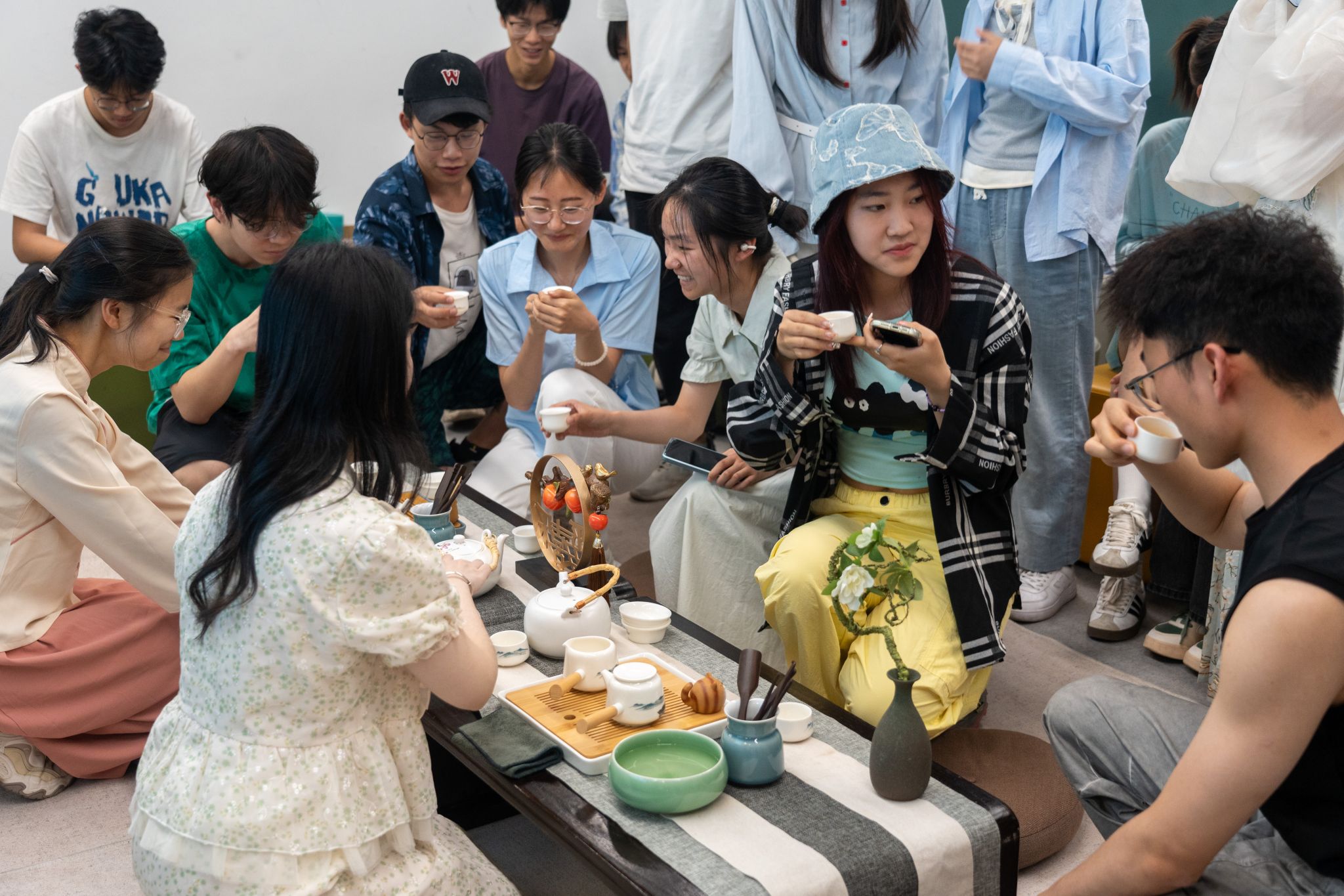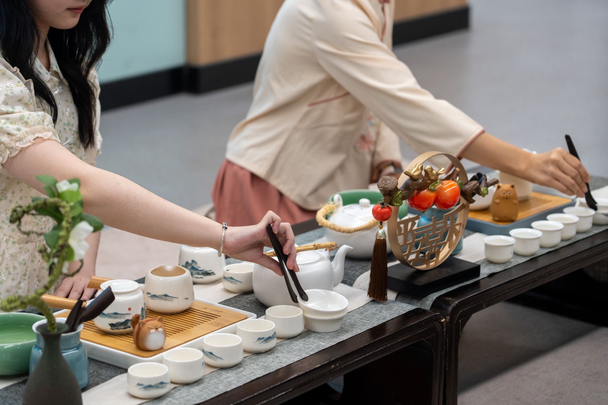 工作室负责人谢铃萱向在场学生介绍了常见的茶的种类、制作工艺、冲泡方法和养生功效等。随后,伴随着悠扬的乐曲,茶艺表演队成员进行茶艺表演、解说和体验指导。无论是温壶、投茶、侯汤、冲茶,还是刮沫、淋壶、烫杯、出汤、斟茶,优雅的表演无一不吸引同学们的目光,同学们如同置身山水之间,细细品味中国茶道精神,认真感受中国的“静”和“美”。表演结束后,现场的同学们积极参与茶艺表演体验,过程中茶艺表演队成员悉心指导,在认真学习后,同学们很快掌握了表演技巧,并将冲泡出的香气四溢的茶水让在场同学品鉴。