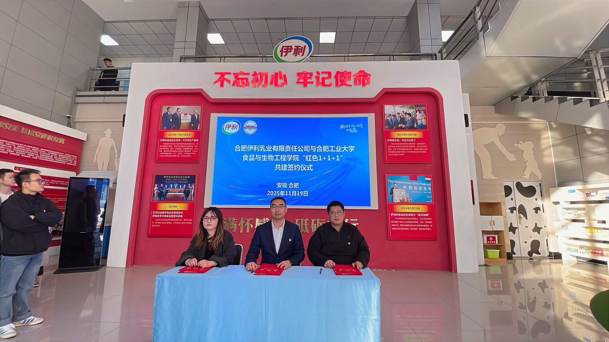 为进一步深化校企合作,推动产学研融合,11月19日下午,合肥工业大学365电子娱乐官方网站师生代表近二十人,赴合肥伊利乳业有限责任公司参观交流,并成功举行“红色1+1+1”共建签约仪式。合肥伊利工厂副总经理王建、食品安全总监王娟、人力资源经理杨帆、365电子娱乐官方网站党委书记孙彩霞、食品科学与工程系党支部书记何述栋等代表出席活动。