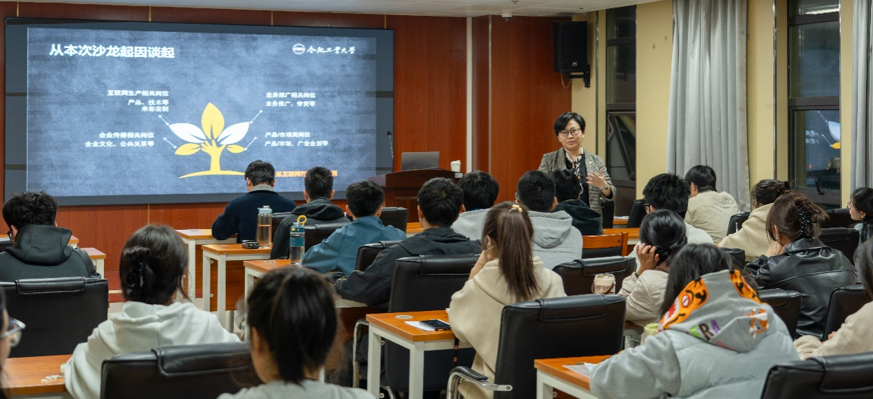 朱文颖老师依托深耕人才开发与评价、企业管理领域近20年的经验,为同学们系统梳理了新媒体行业的发展脉络和就业趋势。她从当前新媒体生态的特点出发,详细介绍了内容创作、平台运营、数据分析、电商直播等热门就业方向,帮助同学们建立清晰的职业认知,分享了“三位一体”的能力建设方案:扎实的专业知识是根基,持续的学习能力是保障,创新的思维方式是优势。