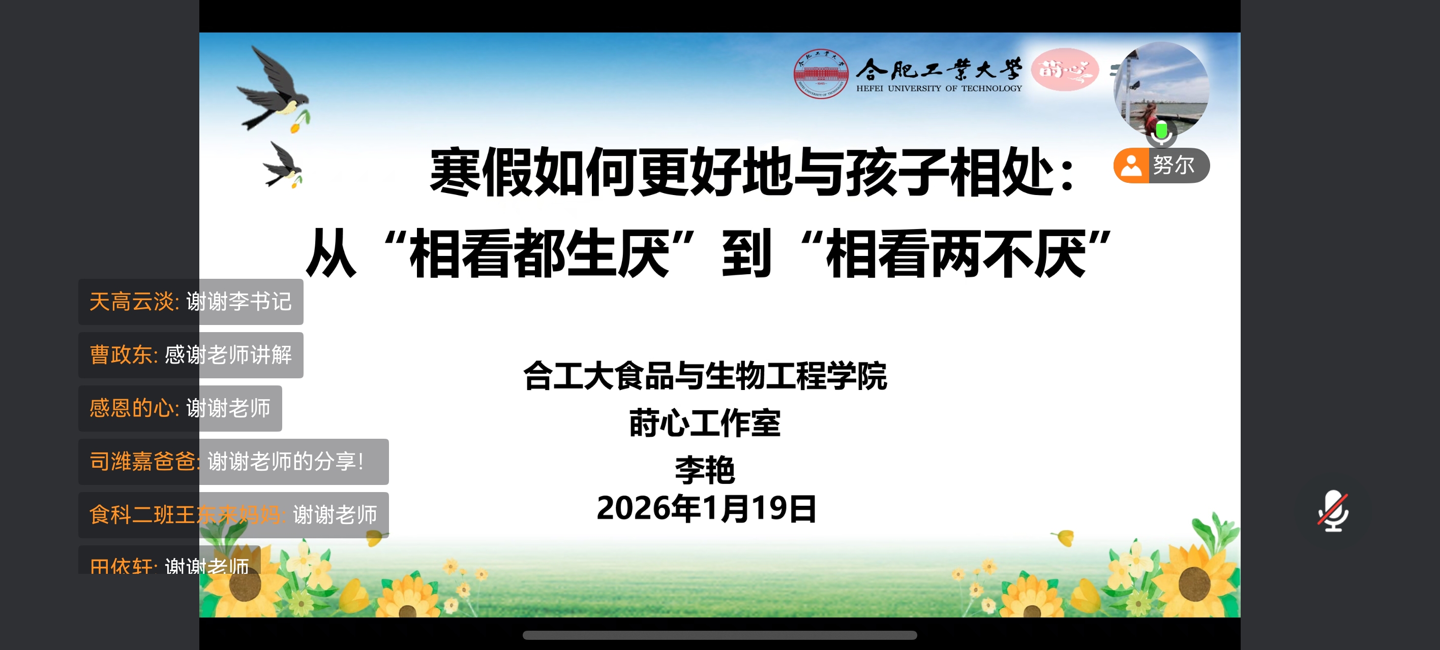 李艳从大学生心理发展特点入手,深入浅出地分析了寒假期间亲子互动中的常见问题及其背后的心理机制。她系统性地为家长提供了五大实用沟通技巧:重视关系建立、构建平等对话、设定合理边界、运用非暴力沟通、创造共同意义。这些具体可操作的方法,为家长提供了科学的指导和实践路径。她强调,家长要实现从"全面呵护"到"尊重支持"的教育理念转变,努力构建和谐温暖的亲子关系,让家庭成为孩子汲取力量、安心成长的精神港湾。李艳特别提醒家长要关注自身成长,在关爱孩子的同时也要照顾好自己,培养个人兴趣爱好,积极实现自我价值,从而达到"家长与孩子共同成长"。