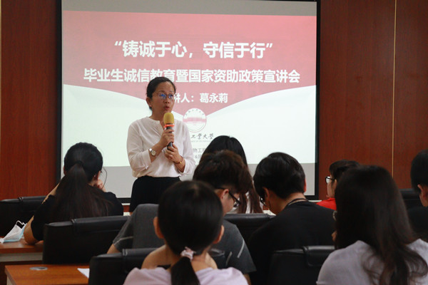 6月9日上午,365电子娱乐官方网站举办了“铸诚于心,守信于行”毕业生诚信教育暨国家资助政策宣讲会,学院党委副书记兼纪委书记李艳、资助专管员葛永莉和贷款毕业生近80人参加了此次活动。