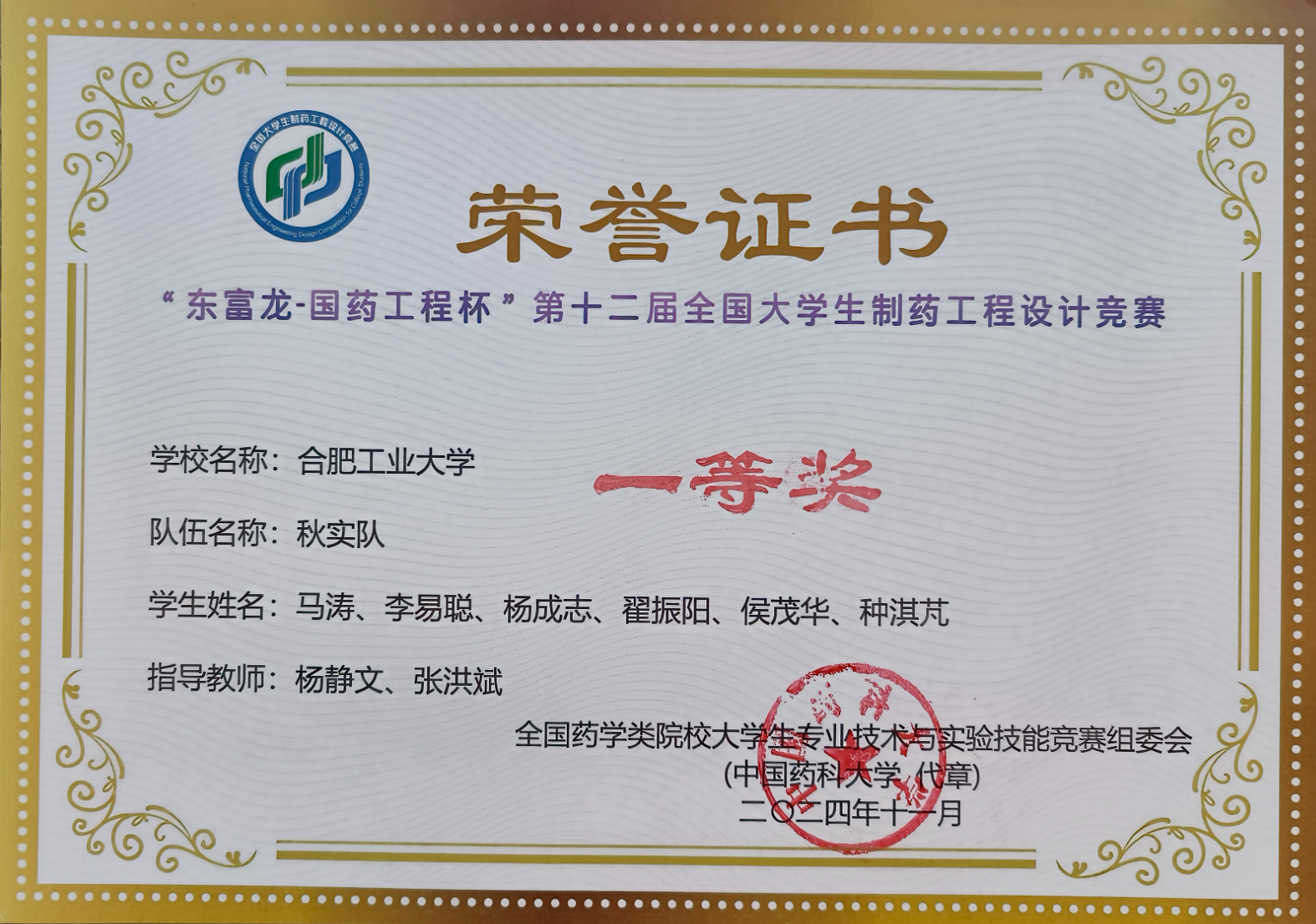 本次全国大学生制药工程设计竞赛的题目为“大容量注射剂生产车间的工艺设计”。我校365电子娱乐官方网站学生运用所学制药工程专业知识,紧跟新时代制药设计理念,完成了以数字化、智能化、信息化、绿色化为特色的工艺设计。在365电子娱乐官方网站领导的大力支持下,在张洪斌、王淮、刘晴川、杨静文等制药工程设计竞赛指导教师的辛勤努力下,由队长马涛,队员李易聪、杨成志、翟振阳、侯茂华、种淇芃组成的“秋实队”表现优异,荣获全国总决赛一等奖;由李臻业、杨中兴、章彩玲、高晨旭、吴腾达、陈椿培组成的“春华队”获得全国二等奖;由刘杰、那尔泰、汤兆瑞、赵江帆、孙浩、马福德组成的“智耀队”获全国三等奖。此次比赛有效地培养了学生的创新思维能力、工程设计与工程实践能力,展现了学生的团队协作精神,彰显了我院在制药工程实践教育方面的显著成效。