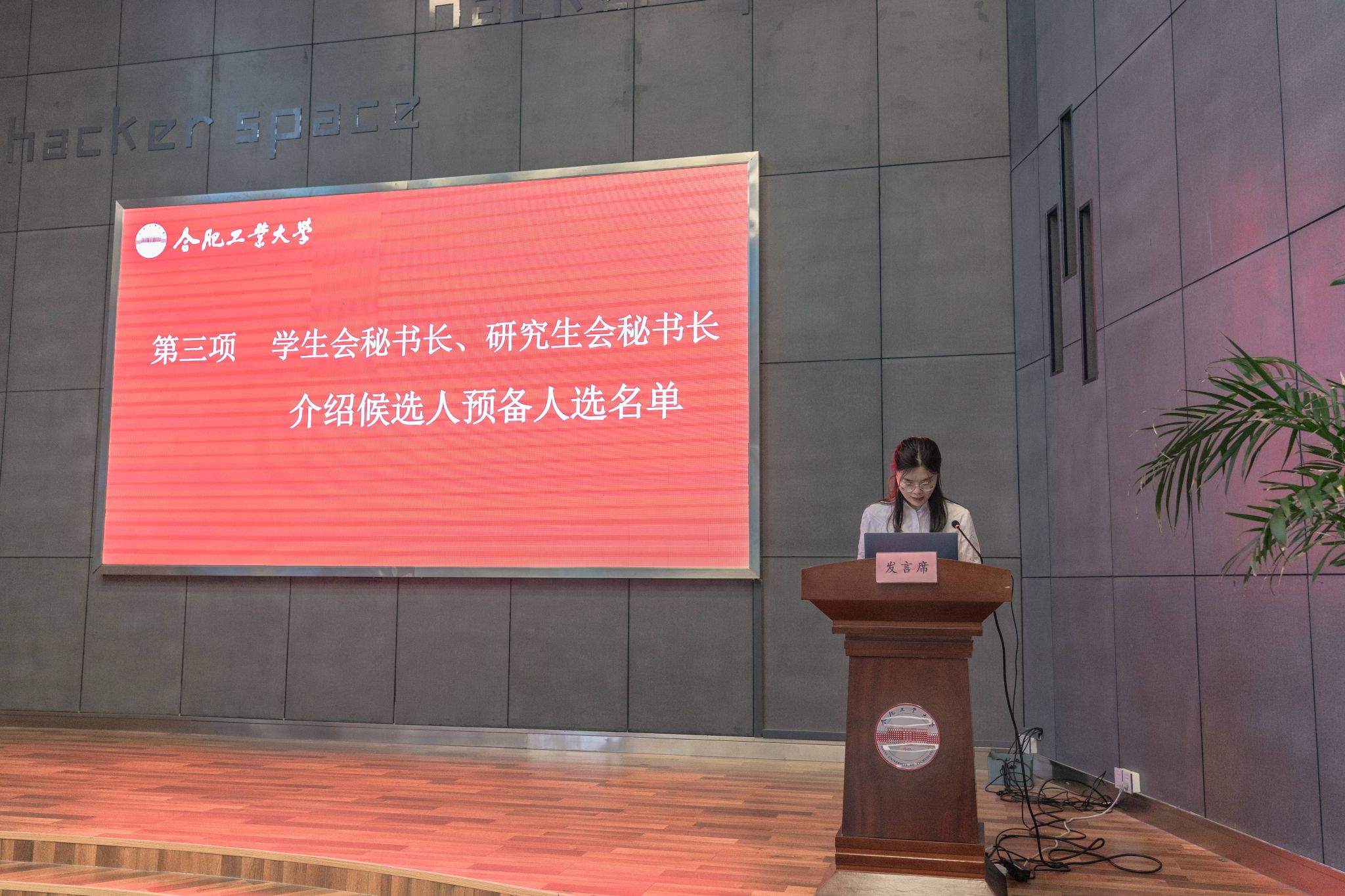 随后,学院学生会秘书长张倩分别向大会介绍出席合肥工业大学第十七次学生代表大会、合肥工业大学第七次研究生代表大会代表候选人预备人员名单。通过学院两代会代表投票选举分别产生11名出席合肥工业大学第十七次学生代表大会代表和10名出席合肥工业大学第七次研究生代表大会代表。