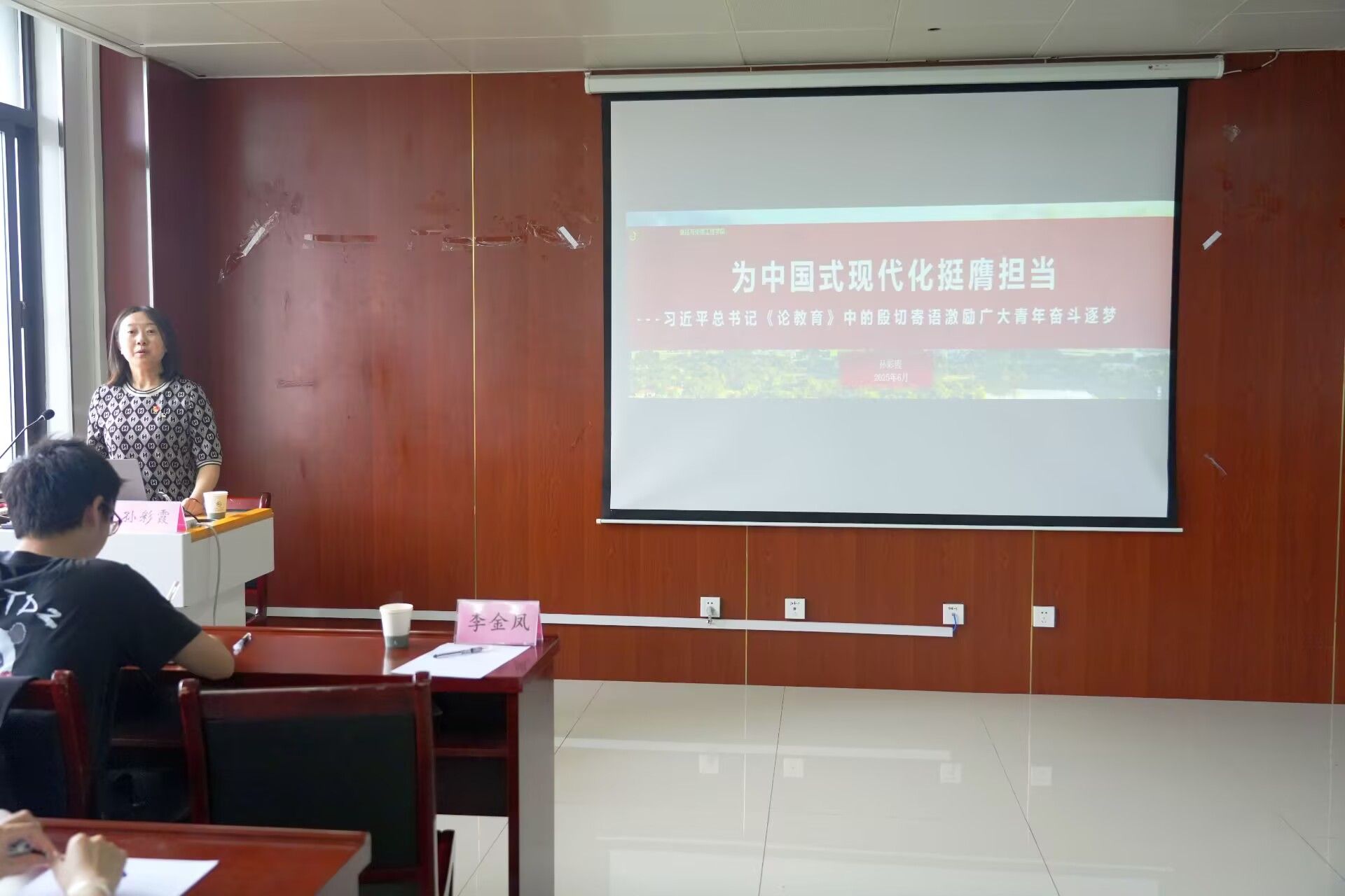 首先,学院党委书记孙彩霞主讲“为中国式现代化挺膺担当”主题党课,她以习近平总书记《论教育》中对广大青年的殷切寄语开篇,激励毕业生党员在民族复兴的征程上勇毅前行。党课围绕“办好中国特色世界一流大学”的宏伟目标,深入阐释了“扎根中国大地,走出一条建设中国特色、世界一流大学新路”的深刻内涵与时代要求。她强调,作为新时代青年,特别是党员同志,要自觉将个人理想融入国家发展伟业,深刻理解并践行总书记对青年学子的嘱托。课程尾声,孙彩霞带领全体毕业生党员重温“爱国三问”——“你是中国人吗?你爱中国吗?你愿意让中国拥有更加光明的前景吗?”这振聋发聩的叩问在会场激荡起深沉的回响,承载着对毕业生党员的谆谆教诲与无限期许。