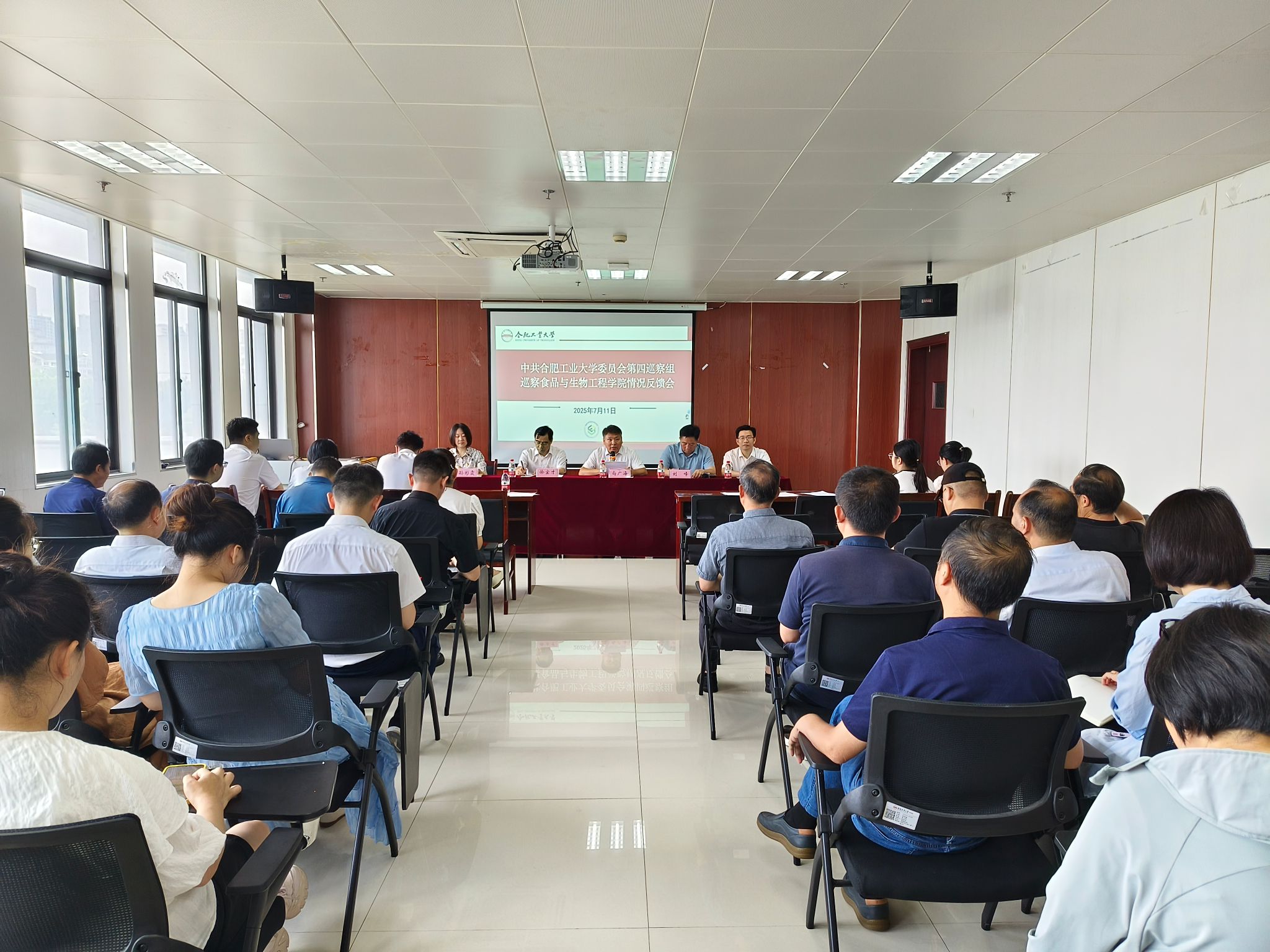 7月11日上午,中共合肥工业大学委员会第四巡察组巡察365电子娱乐官方网站情况反馈会在食品学科楼306会议室召开。党委巡察工作办公室主任刘峰、巡察组全体成员、学院全体教职工参加会议。会议由院党委书记孙彩霞主持。