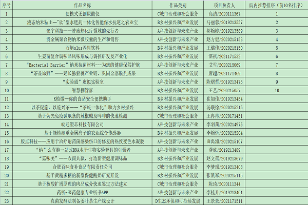 学院竞赛工作小组共收到申报作品23件,其中科技创新和未来产业类作品8件、乡村振兴和产业发展类作品10件、城市治理和社会服务作品类4件、生态环保和可持续发展类作品1件。本着公平、公正、公开的原则,通过现场答辩,现将初评结果公示如下: