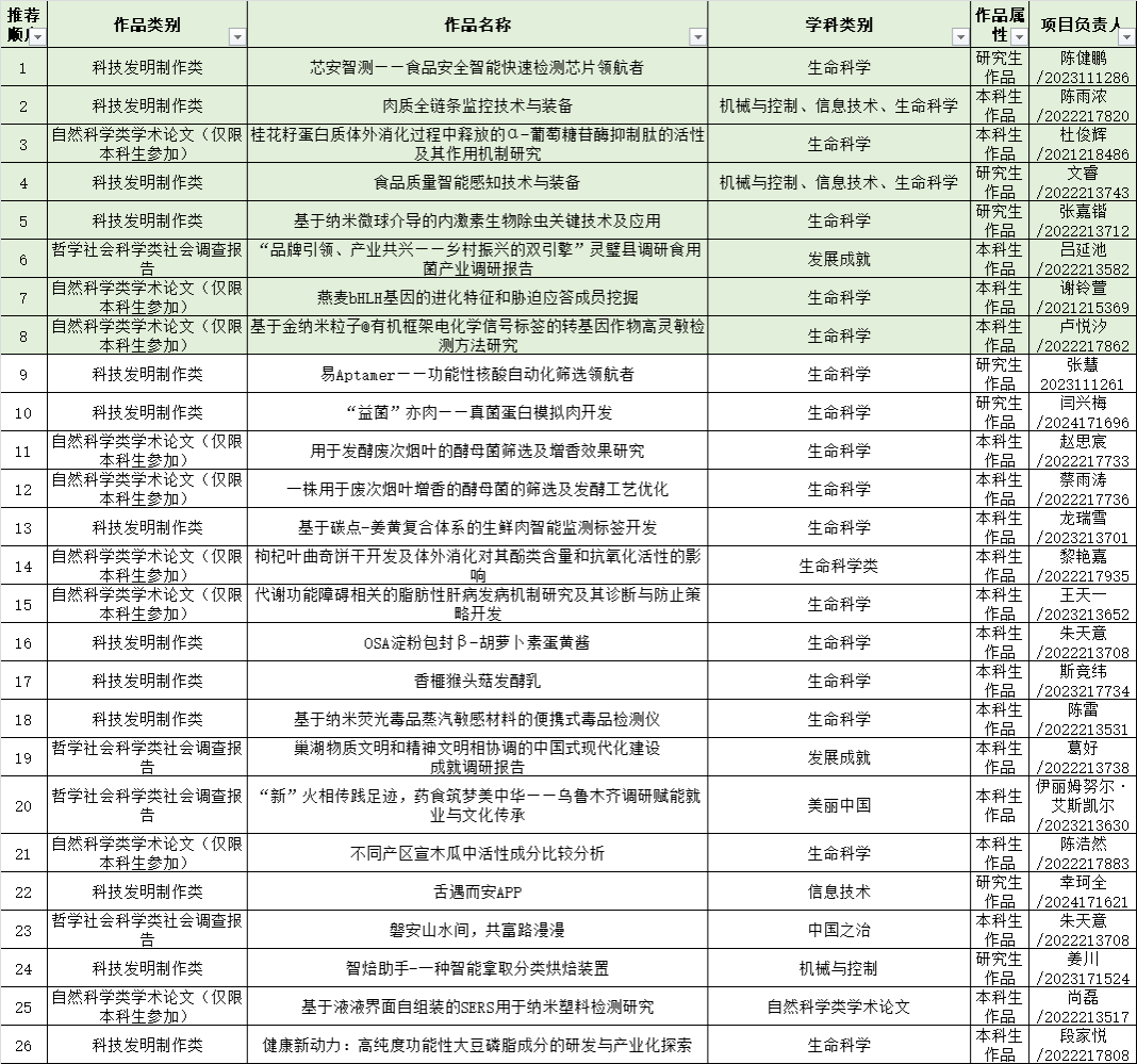 学院竞赛工作小组共收到申报作品26件,其中自然科学类学术论文9件、哲学社会科学类(学术论文和社会调查报告)4件、科技发明制作类13件。本着公平、公正、公开的评审原则,学院组织学生线上、线下答辩,专家评审,现将学院初评结果(推荐排序前8作品)公示如下: