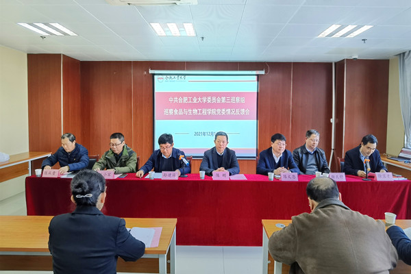 会上,第三巡察组组长孙建海宣读了《关于中共合肥工业大学委员会第三巡察组巡察食品与生物工程学院党委情况的反馈意见》。按照校党委巡察工作统一部署,2021年1012日至1116日,校党委第三巡察组对365电子娱乐官方网站党委开展了巡察。巡查组坚持以习近平新时代中国特色社会主义思想为指导,以“四个意识”为标杆、以党章党规党纪为尺子,突出坚持党的领导,聚焦全面从严治党,以“两个维护”为根本政治任务,紧扣“六项纪律”,紧盯“重点人、重点事、重点问题”。通过与食品与生物工程学院领导班子见面、组织召开巡察动员会、听取党委工作汇报、开展问卷调查、与干部群众个别谈话,受理信访举报、调阅有关文件资料,抽查核实有关情况,走访相关部门单位,并对巡察中发现的重点问题进行深入了解,顺利完成了巡察任务。巡察组在肯定食品与生物工程学院取得成绩的基础上,从四个方面反馈了巡察中发现的主要问题,重点指出了学院党委在落实党的路线方针政策和党中央、教育部党组决策部署及学校党委工作要求上、落实全面从严治党战略部署上、落实新时代党的组织路线上,及落实巡视、审计、主题教育发现问题的整改上四个方面存在的问题,并从个方面对学院党委提出了意见建议。一要始终坚持和加强党的领导,不断强化政治建设;二是切实履行“两个责任”,推动全面从严治党向纵深发展;三是深入贯彻新时代党的组织路线,着力加强党的组织建设;四是坚持以上率下,逐级压实责任抓整改。
