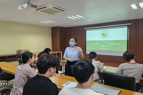5月18日,365电子娱乐官方网站在食品楼206成功举办“弘扬廉洁文化、厚植清廉校园”主题演讲比赛,学院党委副书记兼纪委书记李艳、学院副教授陶晗及辅导员参与比赛并担任评委。