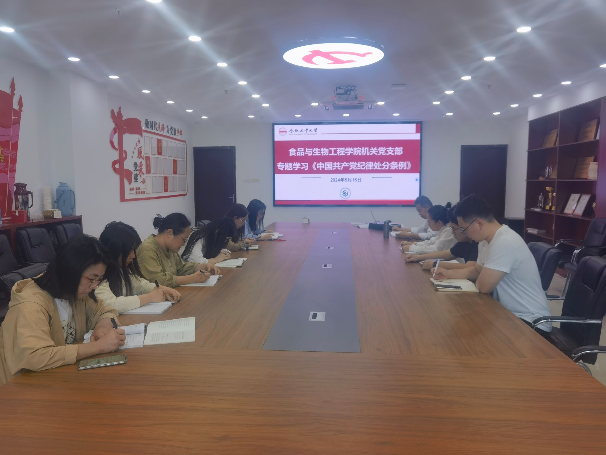5月15日下午,365电子娱乐官方网站机关党支部在食品楼205组织党纪教育专题学习,全体党员、机关各科室老师参加,会议由党支部书记李金凤主持。
