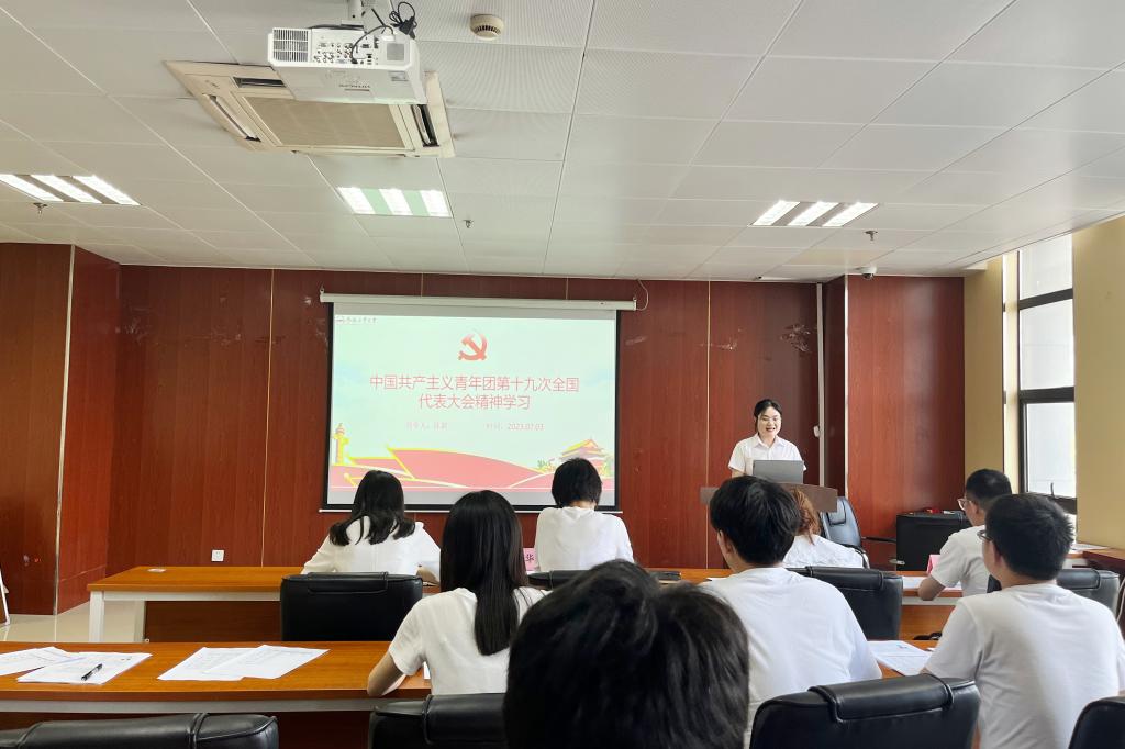 会议在庄严的国歌声中拉开序幕,首先,陈颖同学进行“弘扬伟大建党精神,夯实青年思想根基”专题领学。第一部分,“弘扬坚持真理、坚守理想的精神,坚定理想信念”,全体研究生会成员认真学习了伟大建党精神的实质内涵,充分认识到理想指引人生方向,信念决定事业成败,理想信念是精神上的“钙”,是鼓舞青年团员成长成才的动力之源;第二部分,“弘扬践行初心、担当使命的精神,厚植爱国情怀”,通过对伟大建党精神的学习,让每一位青年铭记,爱国是人世间最深层、最持久的情感,是一个人立德之源、立功之本;第三部分,“弘扬对党忠诚、不负人民的精神,培育奉献品格”,青年是最富有激情和理想的一代,渴望成功实现人生价值与理想,个人价值的实现离不开国家民族的发展与繁荣,只有把人生理想融入国家和民族事业中,才能最终成就一番事业。第四部分,对团的十九大会议精神进行领学,团的十九大是在以习近平同志为核心的党中央带领全党全国各族人民迈上全面建设社会主义现代化国家新征程、中国共青团紧跟党开启第二个百年奋斗新篇章的历史时刻召开的一次十分重要的会议,是全国各族团员青年政治生活中的一件大事。
