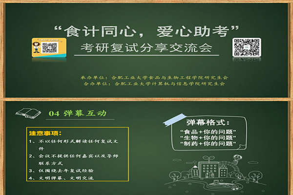 为提升备考学生自信,助力2020研究生复试招生工作,合肥工业大学365电子娱乐官方网站研究生会联合计算机与信息学院研究生会于5月13日下午一点通过斗鱼直播平台开展“食计同心,爱心助考”考研复试分享交流会。本次活动...