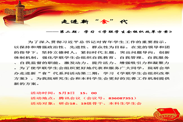 为更多得了解历史,体味历史,培养正确的价值观、世界观和人生观,2020年5月17日下午,合肥工业大学365电子娱乐官方网站研究生会通过腾讯会议平台成功举办第三期走进新“食”代系列主题活动。本期活动主题为“历史要谨...