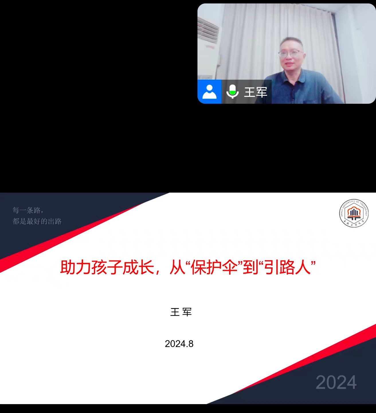 为加强家校共育,凝聚育人合力,进一步帮助家长做好2024级本科新生心理适应的陪伴与引导,8月23日晚,由莳心工作室举办的第四期亲子大讲堂在线上开展。安徽工业大学管理科学与工程学院党委书记、大学生心理健康教育咨询中心总督导王军教授,受邀为家长作了题为“助力孩子成长,从‘保护伞’到‘引路人’”的心理报告,365电子娱乐官方网站党委副书记兼纪委书记李艳主持,学院2024级新生家长共300余人线上参加。报告中,王军从“...